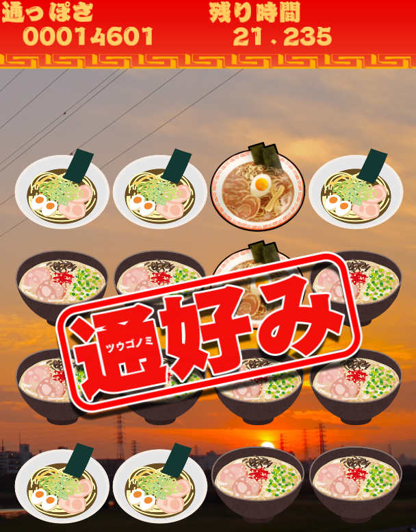 リザルト画面で「今回のラーメン」ボタンを押すと、その回に選んだラーメンを見直すことが出来ます。